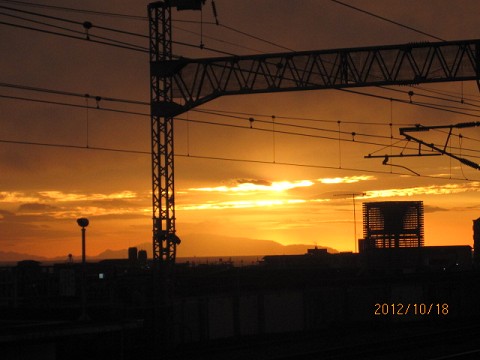 新幹線を待っていると夕焼けがキレイだったので、パシャッ! Σp[【◎】]ω・´)