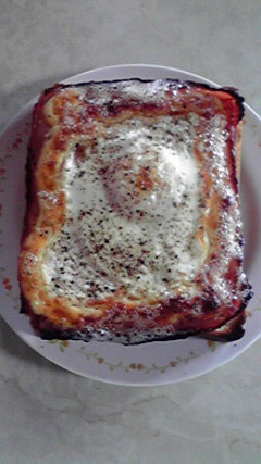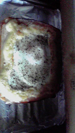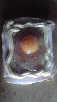 玉子がパンの上から逃げてしまわないように、土手としての役目のマヨネーズなんですが、隙間が開いてたみたいで、オーブンに入れたら、そこからズルリと白身だけが逃げてしまいました^_^;