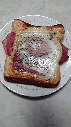 食パンにベーコン置いて、パンの端っこをぐるりとマヨネーズで囲み、生玉子を割り乗せて、塩・コショウ。